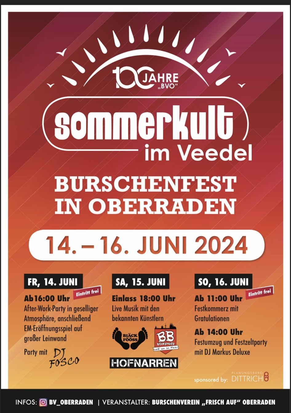 Unter dem Motto „Sommerkult im Veedel“ lädt die Oberradener Dorfjugend anlässlich ihres 100-jährigen Geburtstags Jung und Alt zum Burschenfest vom 14.-16. Juni 2024 ein.